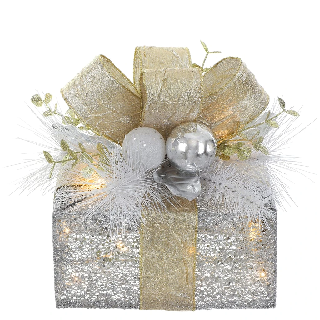 The glittery pine gift box is an attractive accent piece for adding to your holiday decorating scheme. This piece features a handcrafted gift box with pine branch tips, ornaments, and a bow. It is pre-lit with battery-operated LED lights. Display this holiday trimming in indoor locations.