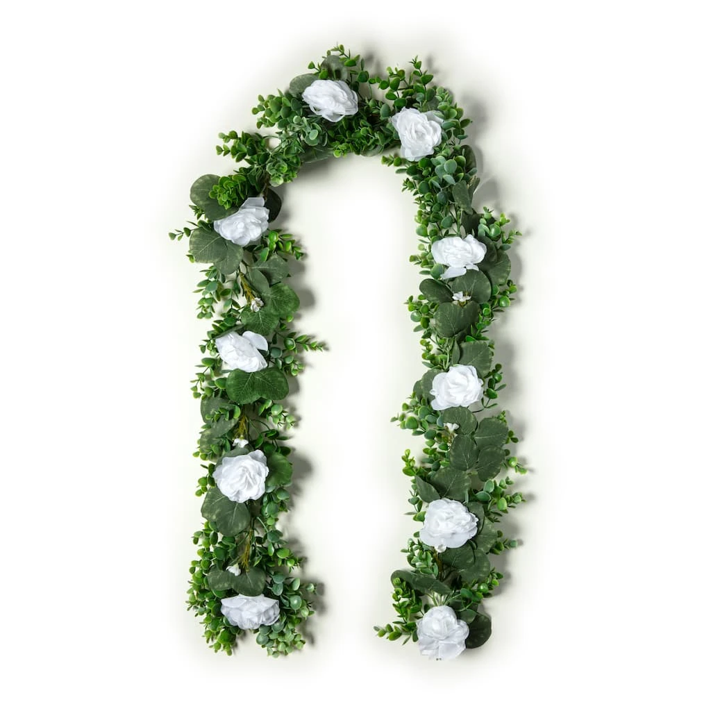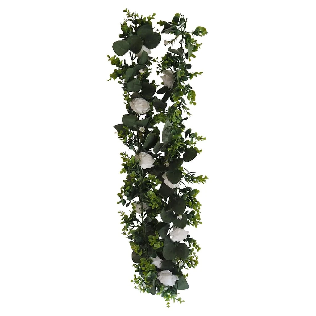 Classy and beautiful, this garland with white roses and green foliage will look great above your mantel. Just add string lights to add some shimmer to your décor.