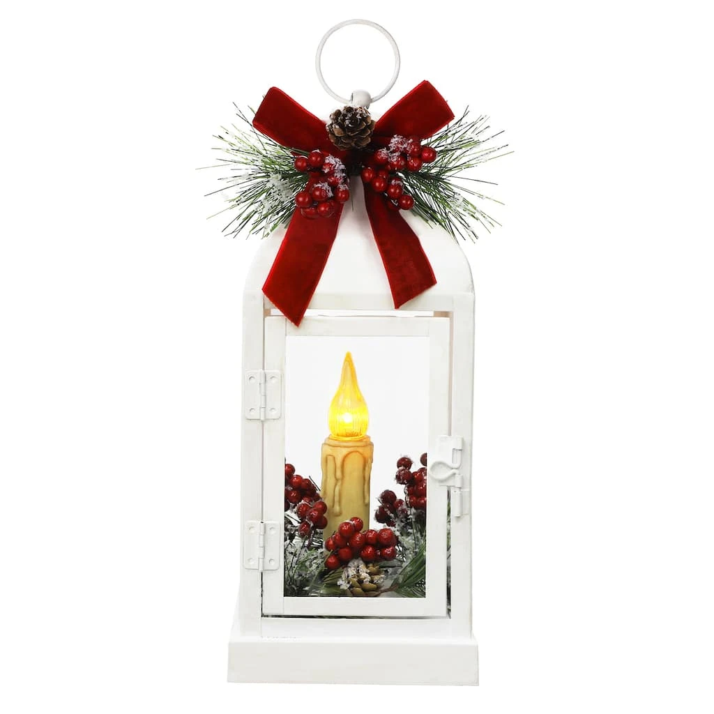 This festive lantern features a battery-operated LED candle surrounded by holly berries. Accented with pine branches, red frosted holly berries and pine cones, this tabletop dรฉcor will be a great addition to your Christmas dรฉcor.
