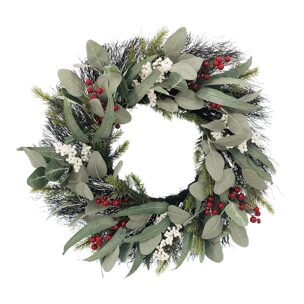 This berry wreath accented with a bundle of eucalyptus and pine branches will add a lovely touch of cheer to your holiday décor. Add bird figurines, pinecones and ribbon, lights and more for a wonderful festive display to greet your guests this Christmas season.