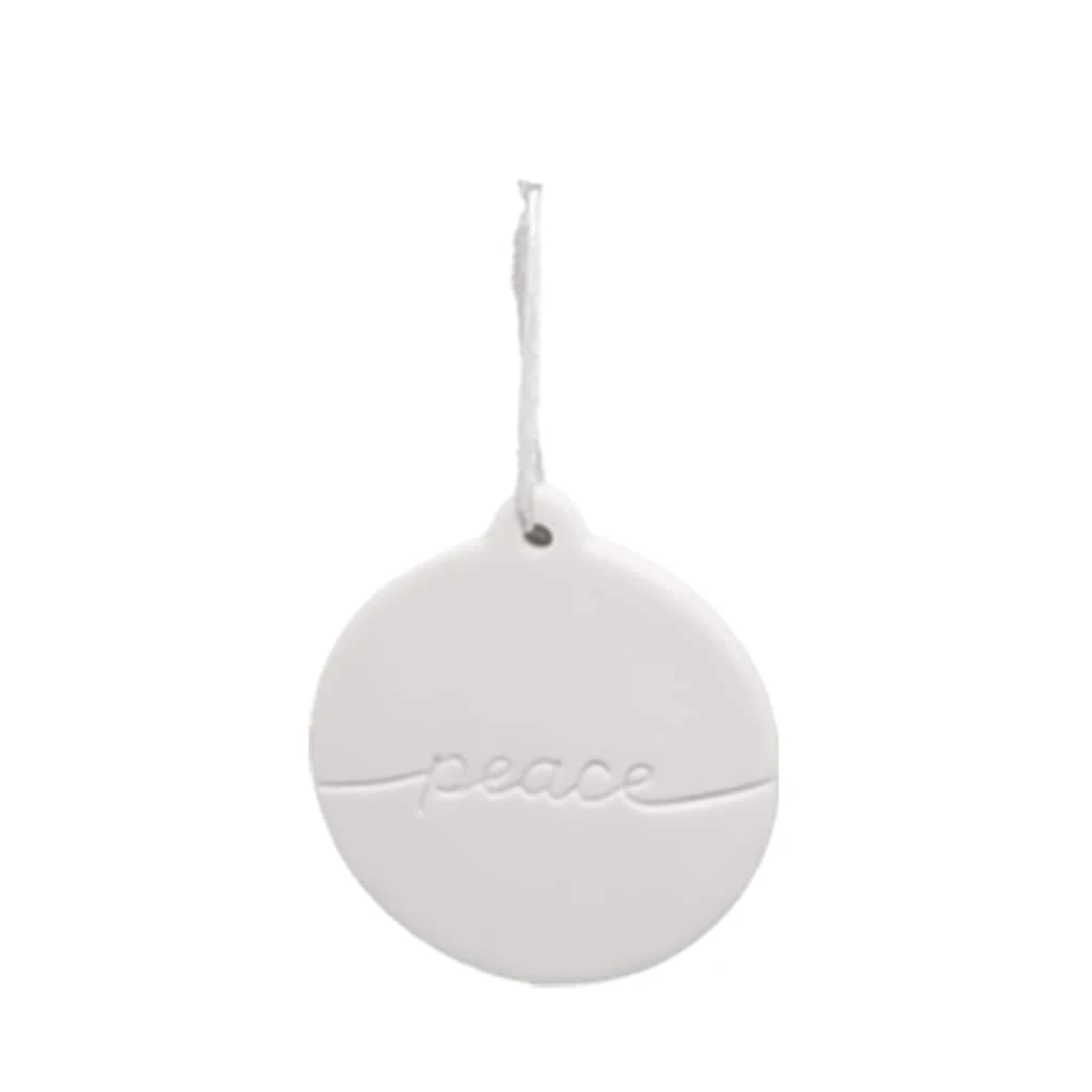 Add your own special flourish to your holiday tree with this unfinished ceramic Christmas ornament, featuring a round shape and the word “peace” engraved across the middle. Use your imagination to give this piece a fun festive touch using paint, glitter, ribbon and more!