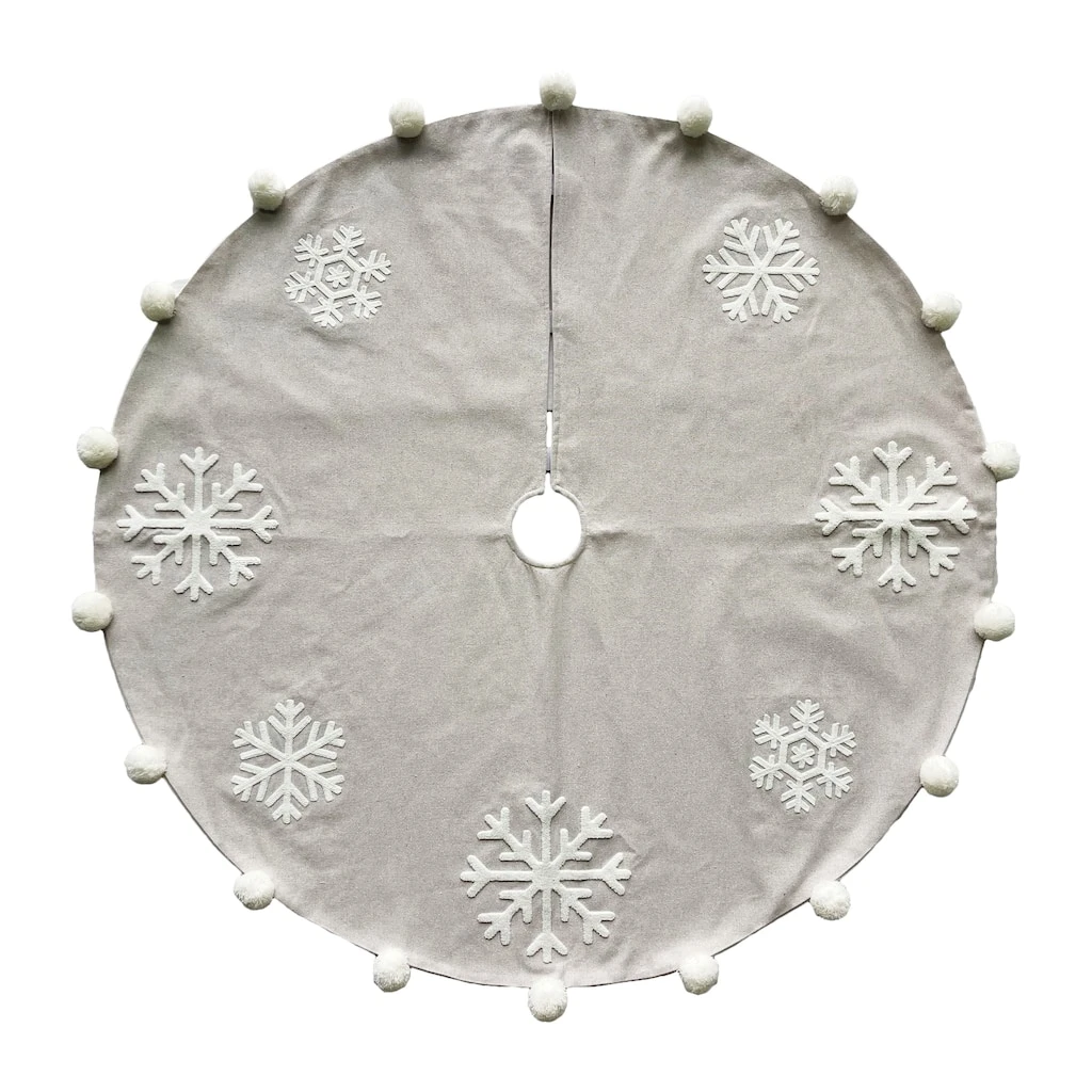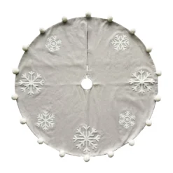 This snowflake tree skirt with pom poms is guaranteed to complement your tree. Team it with ornaments and lights for the perfect holiday display.