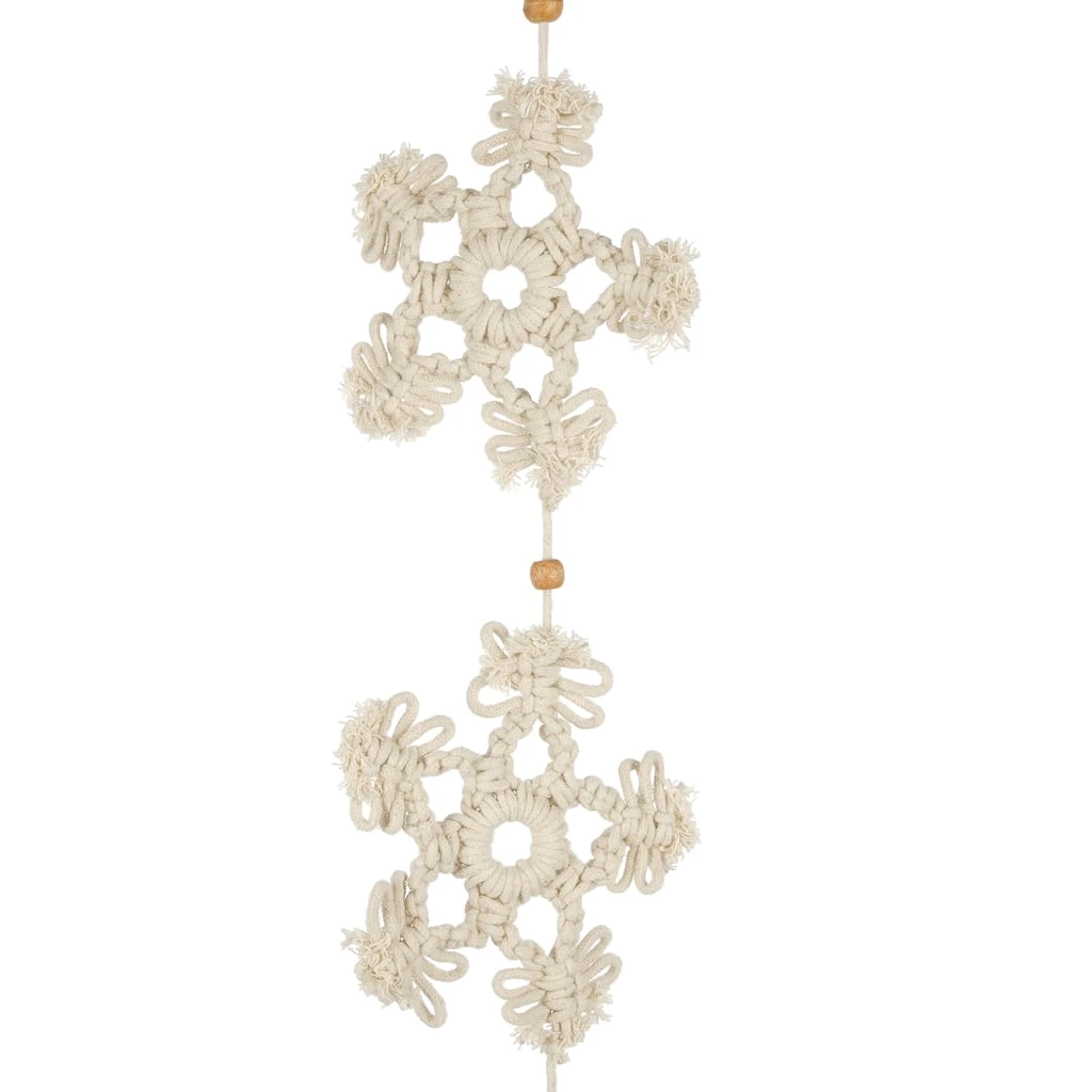 Bring a touch of Christmas magic to your decorating with this charming garland of macramé snowflakes interspersed with little wooden beads. This lovely string makes a great addition to your tree, or drape across a mantel or bannister paired with sparkling lights and ribbon for a festive display full of holiday cheer.