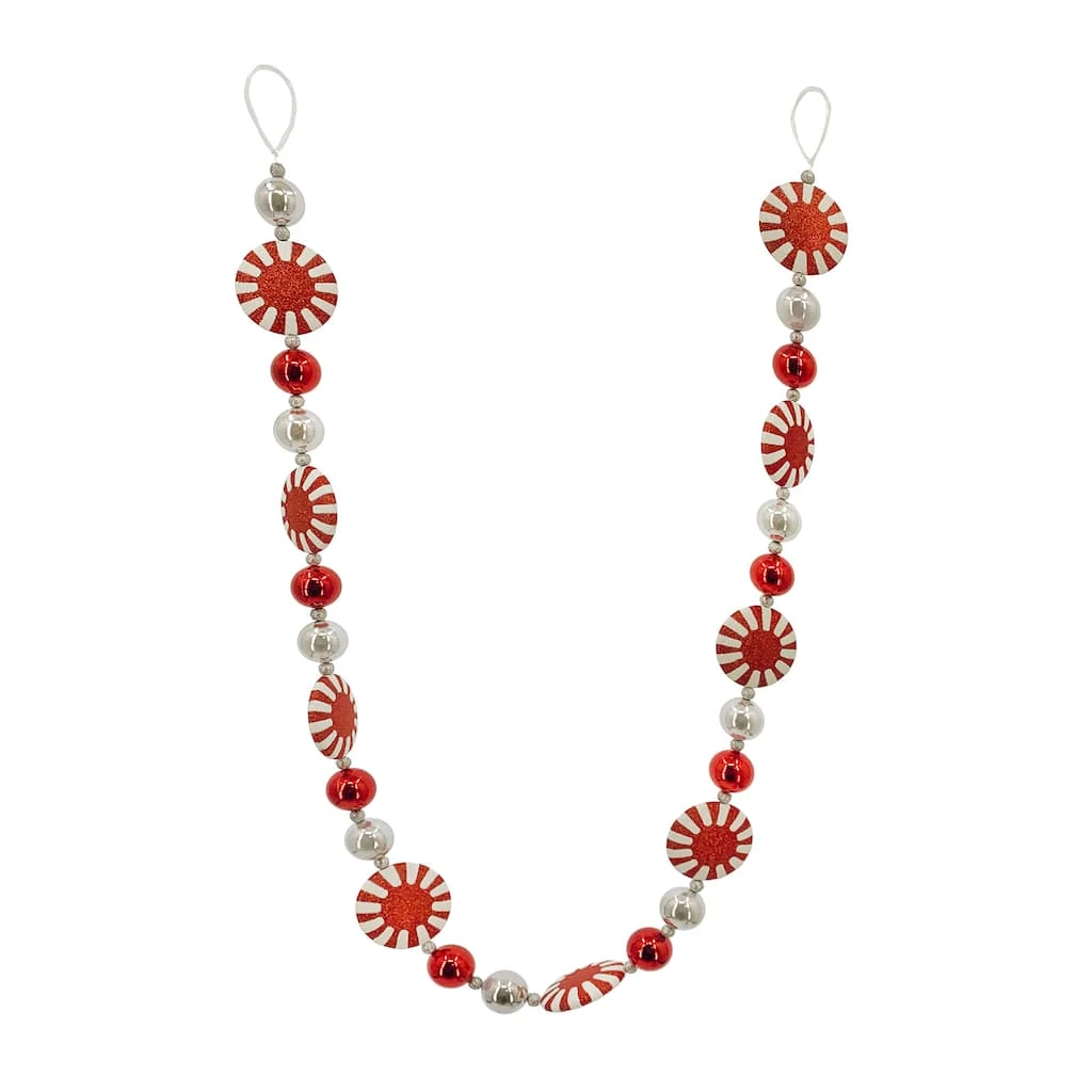 Bring a touch of Christmas magic to your decorating with this lovely garland of glittery peppermint candies and shiny beads. This shimmery string makes a great addition to your tree, or drape over a doorframe, mantel or bannister as is or with added lights and ribbon for a festive display full of holiday cheer.