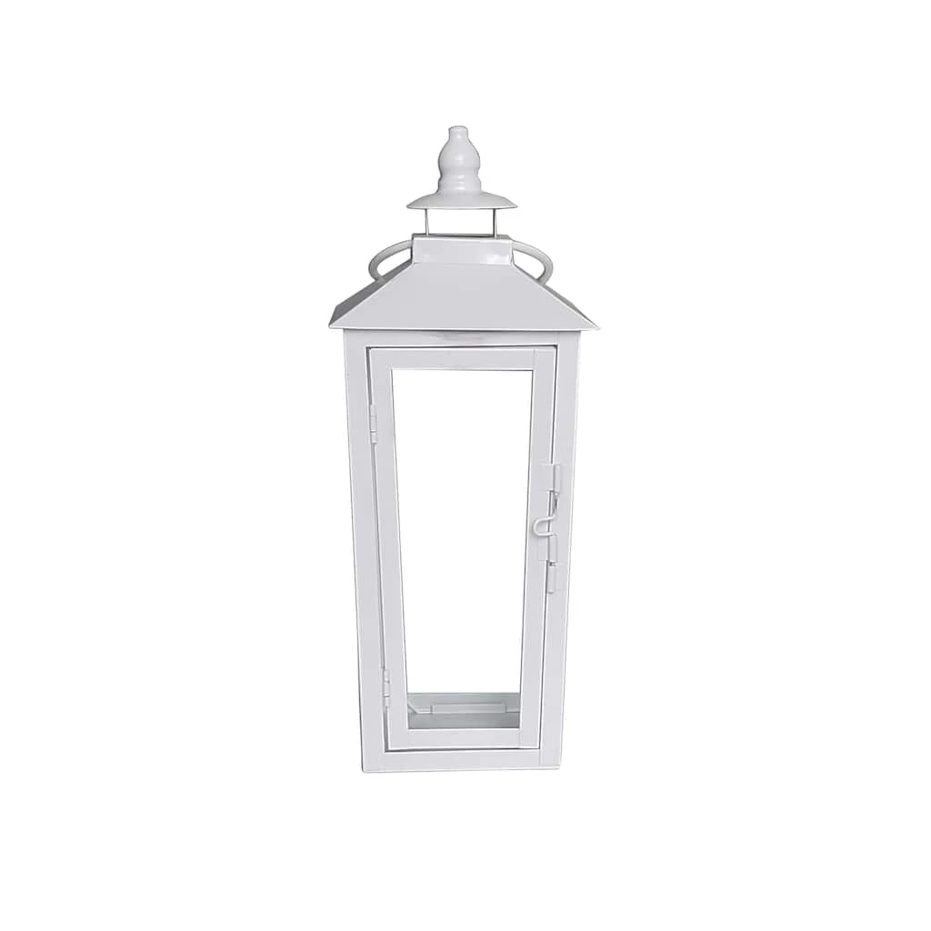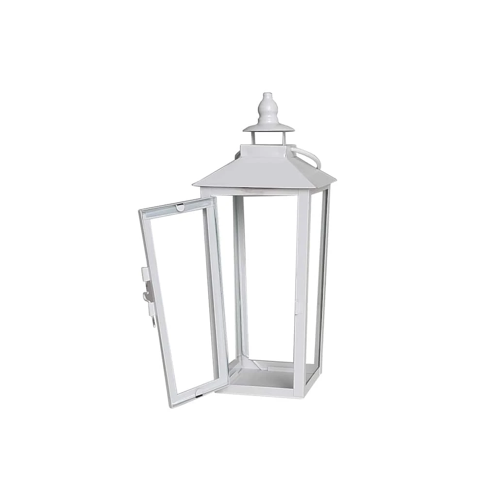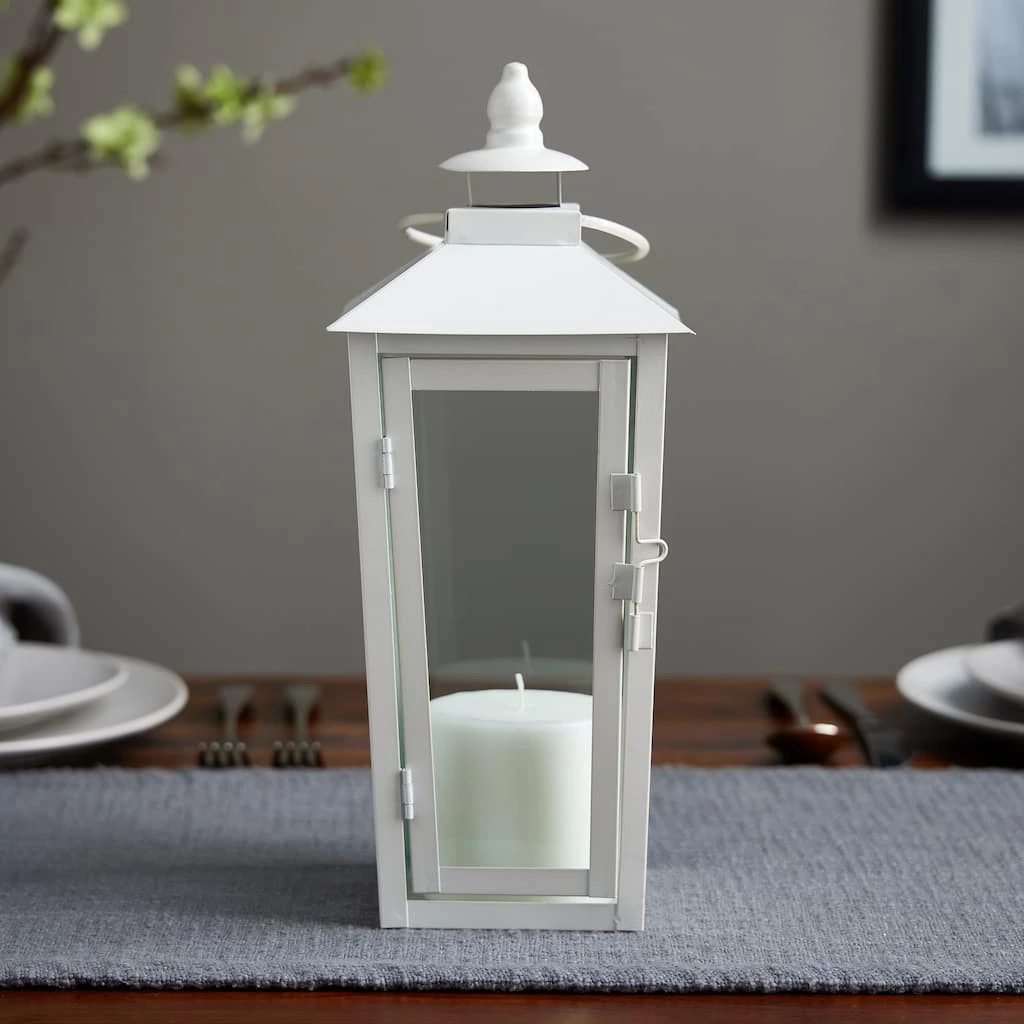 Illuminate your home by placing a candle inside of this white iron lantern. Team it with a beautiful floral arrangement and seasonal accents for the perfect display.