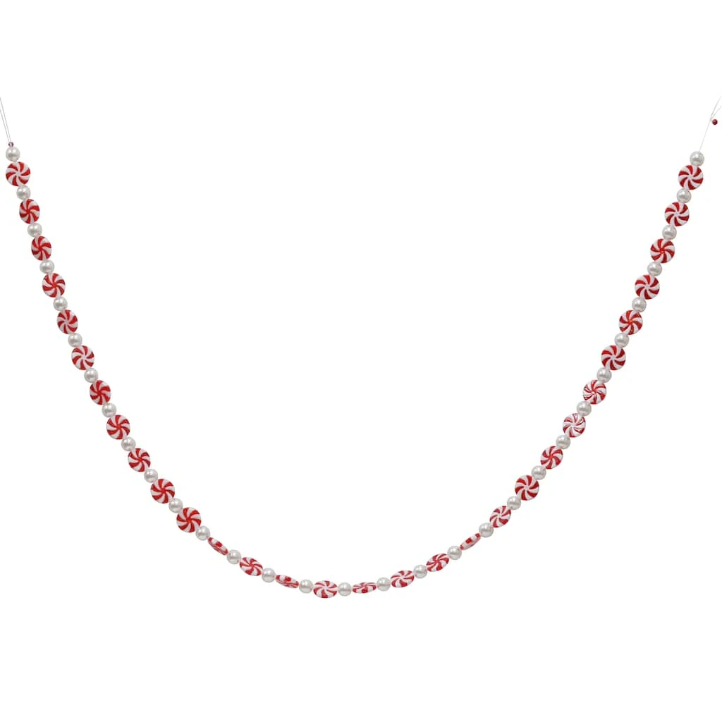 Bring a touch of Christmas magic to your decorating with this playful garland of round red and white peppermint candies and shiny beads. This fun string makes a great addition to your tree, or drape over a doorframe, mantel or bannister paired with lights and ribbon for a festive display full of holiday cheer.