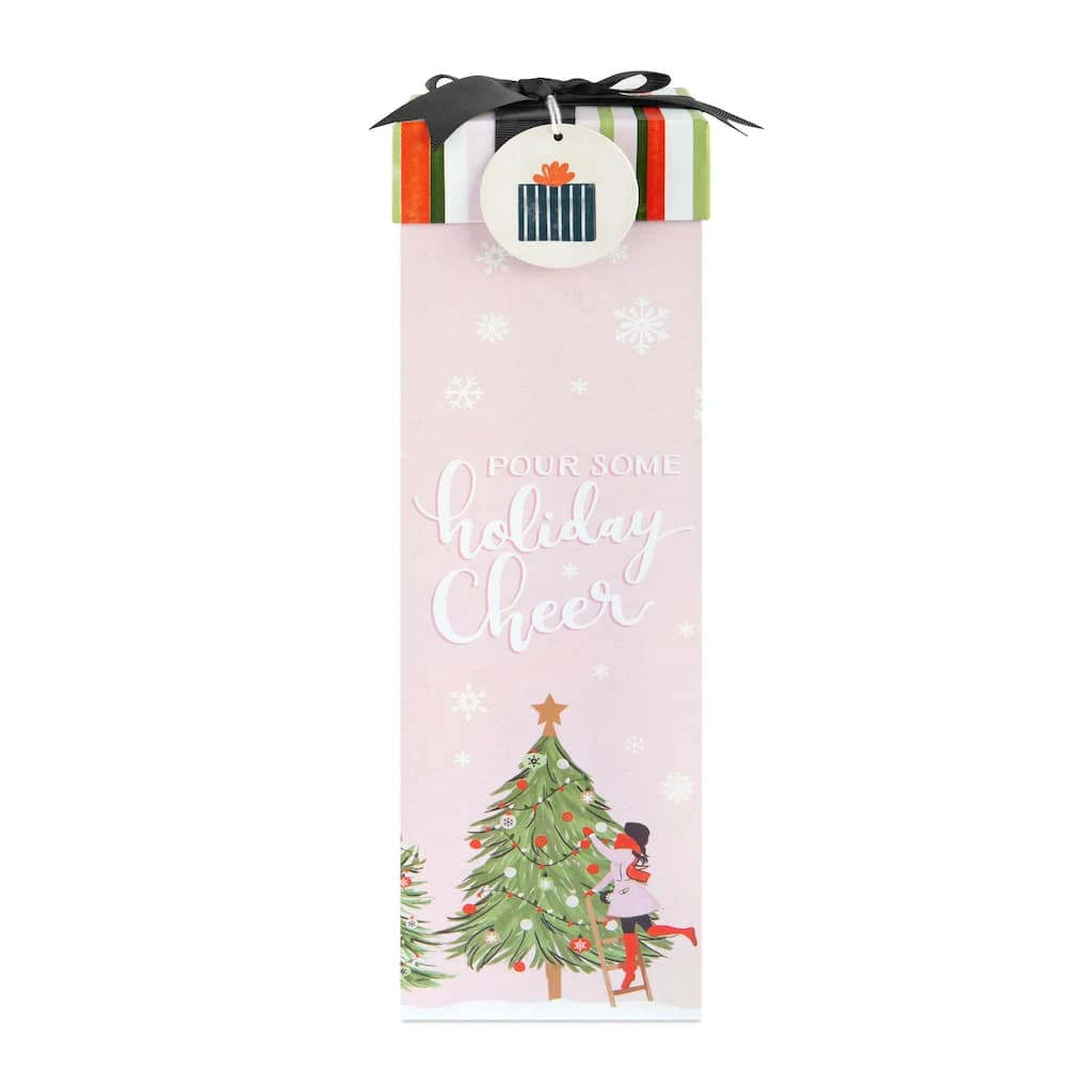 Featuring a fun design of fashionistas decorating for the holidays, this charming box is a fantastic way to dress up your holiday beverage gifts with festive flair. With a pretty black bow and coordinating tag, use to hold a special gift sure to stand out as you celebrate the Christmas season with your loved ones.