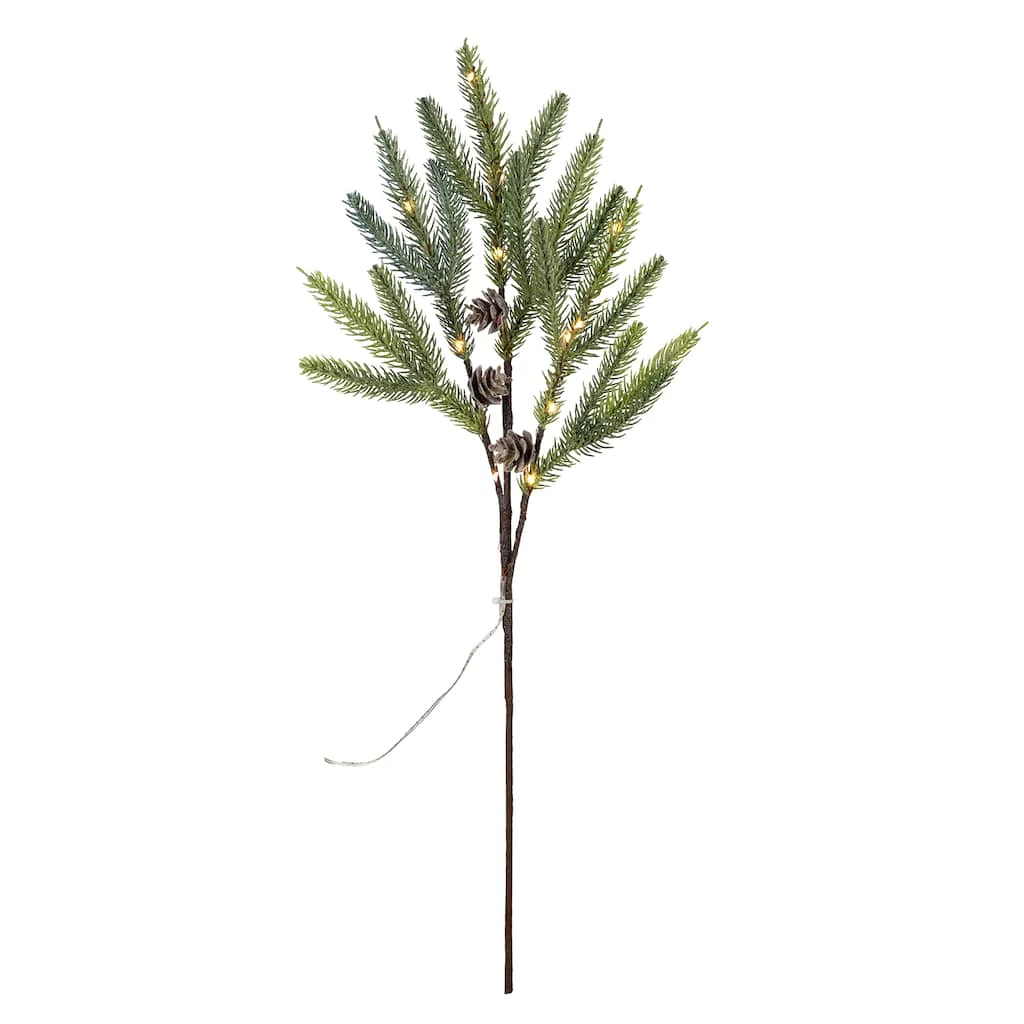 This merry twig with its green pine branches will add some joy to your Christmas decorating scheme. Branches are strung with battery operated warm white lights. This Christmas trimming is perfect for display over doors, windows, fireplace mantels or tabletops, in indoor or covered outdoor locations.