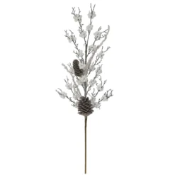 With frosty white berries and a dusting of glitter, this berry and pinecone stem will add a lovely shimmery touch to your Christmas floral projects. Use to bring depth to handmade wreaths and holiday décor or create a stunning arrangement along with frosted pine stems and brilliant red blooms in a tall vase.