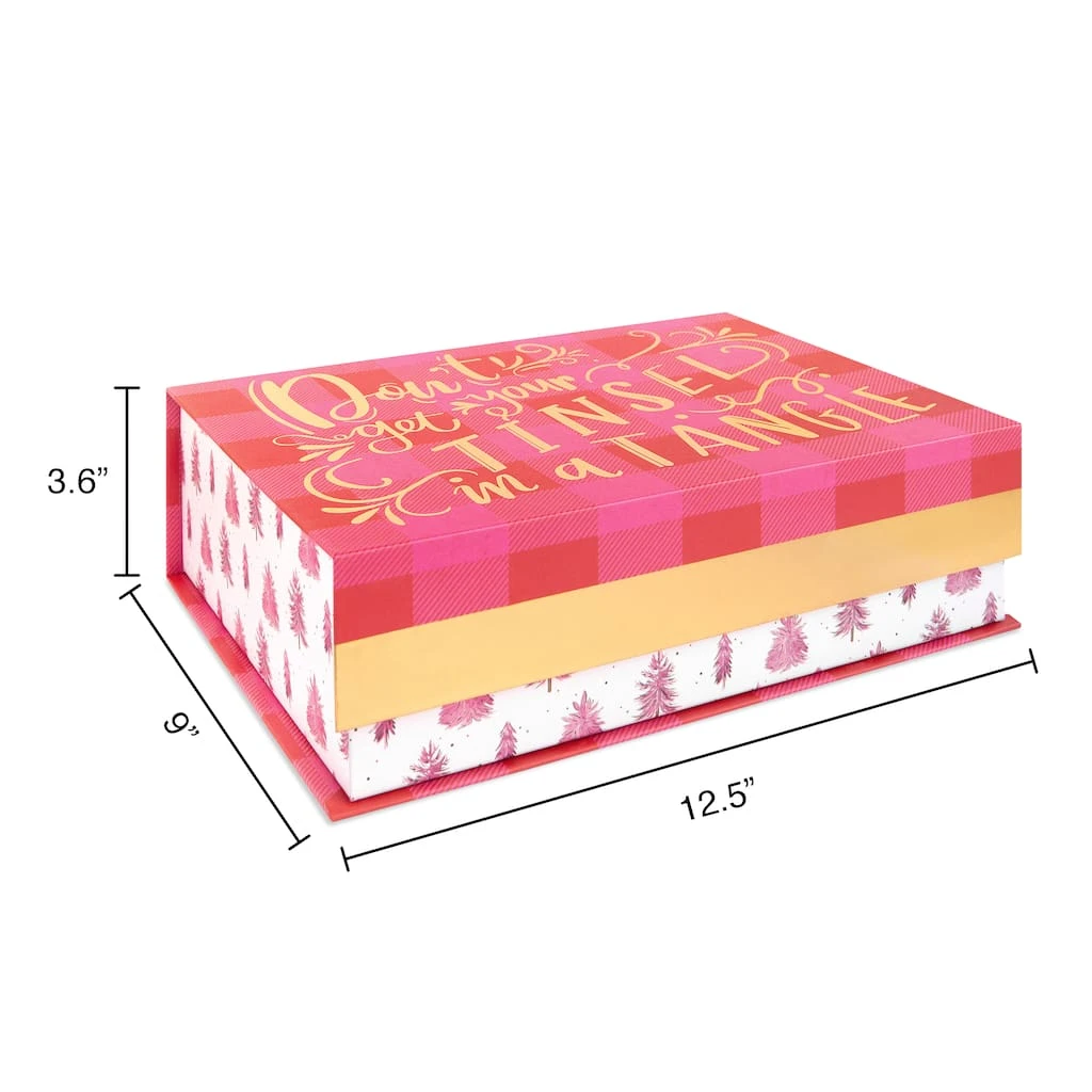 This flip top decorative box is the perfect piece for your home décor and storage. It features “Don’t get your tinsel in a tangle” and a seasonal design with trees.
